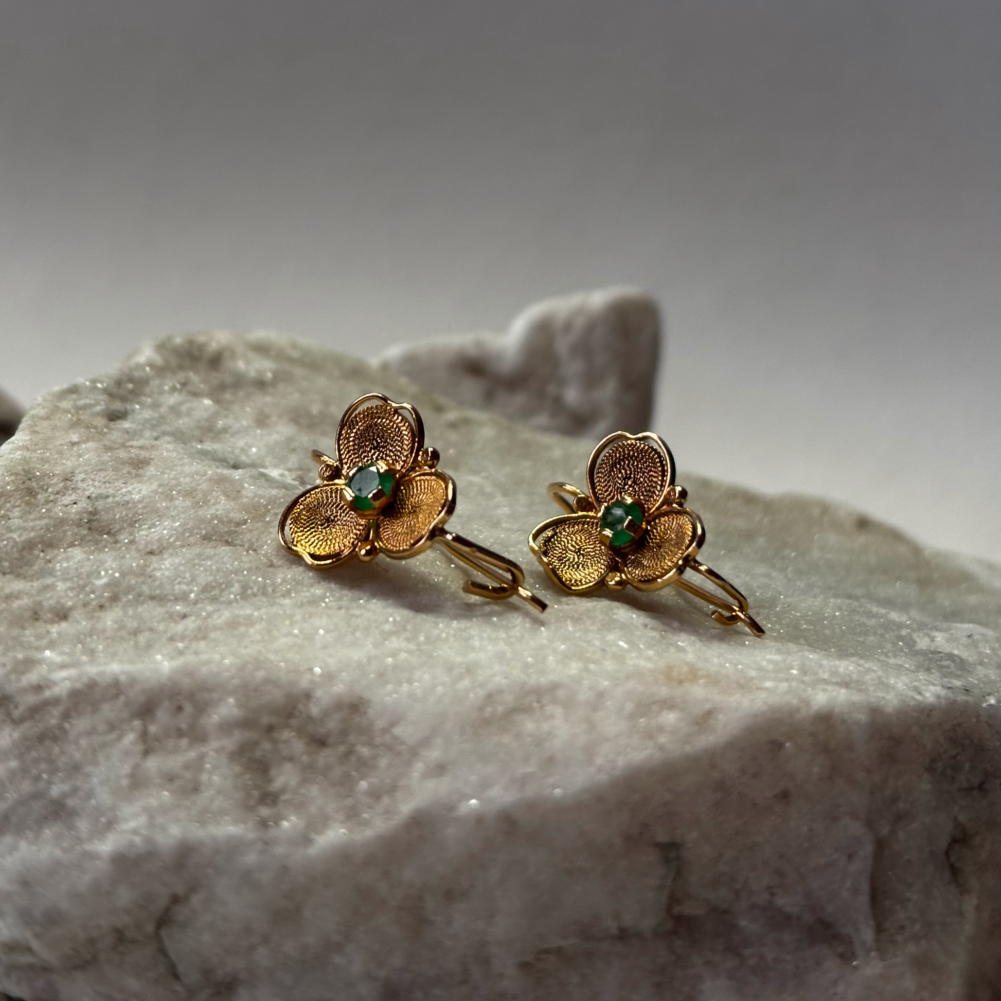 Aretes trébol en filigrana de oro de 18k con esmeraldas naturales colombianas.